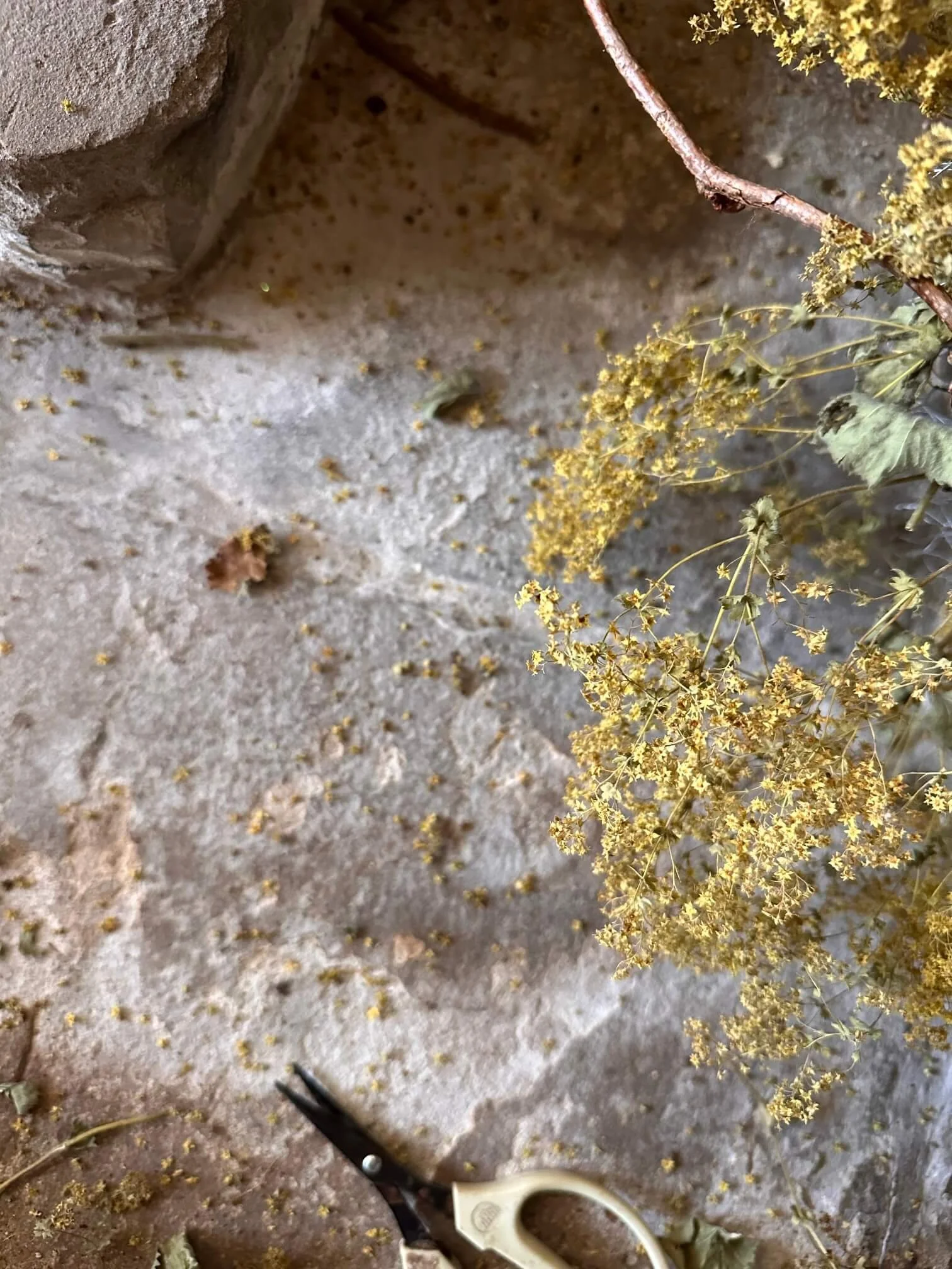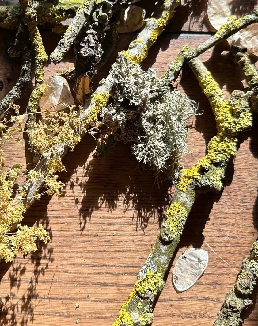 Once dried, the alchemilla mollis flowers lost some of their fresh, bright green zestiness, fading to an earthier ochre hue - echoing the colour of the yellow lichen.