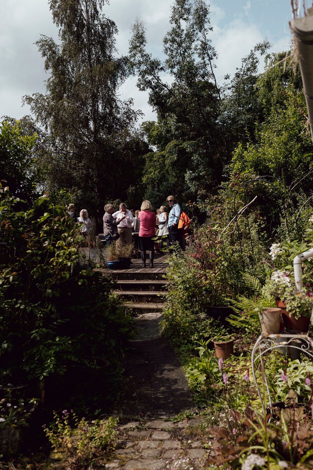 Sturdy, sensible shoes are essential, the ground is uneven and rough in parts - consequently the garden isn't accessible I'm afraid - the paths are cobbled, there are many changes of level and several sets of very steep steps.